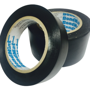 BLACK PVC TAPE that adheres well to both glass and aluminum, removing cleanly and leaving no adhesive residue. The product possesses a medium tack and excellent weather ability.